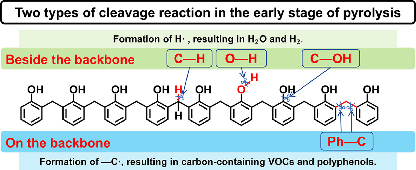 This paper clarified the early stage of the pyrolysis process of phenolic resin and proved that the cleavage reaction of PR occurs beside (CRb) and on (CRo) the backbone by means of molecular simulation based ReaxFF. It was concluded that the reduction of char yield was resulted from the VOC formation.