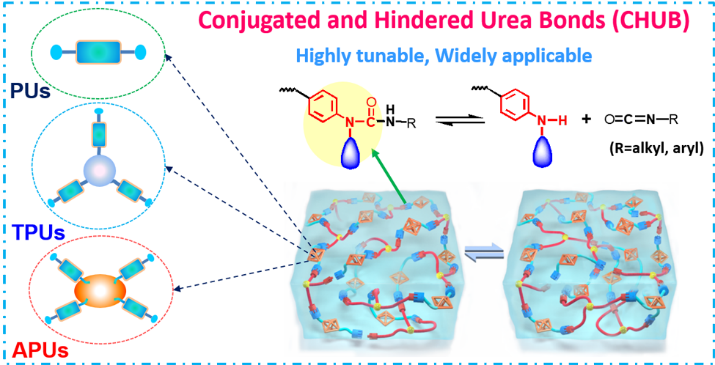 The mechanical robustness and network reconstruction have always been paradoxical in dynamically cross-linked polymers. It is highly desirable to consider polymer architecture while studying chemical bond dissociation to acquire reversible cross-linking networks with high performance. Recently, one paper was published on Macromolecules. A versatile dynamic covalent bond, e.g., a conjugated and hindered urea bond (CHUB), and its dissociation chemistry are reported. Benefiting from the dual effects of conjugation and steric hindrance, CHUB displayed significant and highly tunable reversibility with respect to the polymer network design. Three kinds of dynamically cross-linked networks with widely tuned properties were developed, including the pristine polyurea network, expanded polyurea network containing epoxy cores and networks both cross-linked with traditional and dynamic covalent bonds. The aromatic, stiff backbone of CHUB ensured dynamically cross-linked networks with a considerable glass transition temperature and outstanding mechanical properties. By tuning the ratio of CHUBs with respect to conventional covalent cross-linking points, dynamically cross-linked polymers with good creep resistance were also obtained. The CHUB with both a rigid backbone and high reversibility thus effectively expanded the scope of dynamic covalent bonds and provided efficient routes to catalyst-free, easy-to-synthesis, and efficient renewable networks that are beneficial for theoretical study or practical applications.
