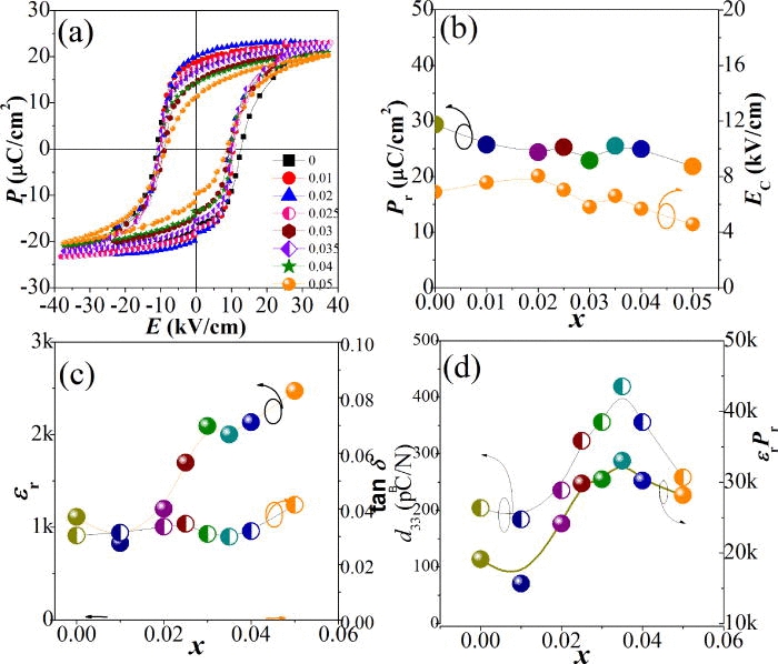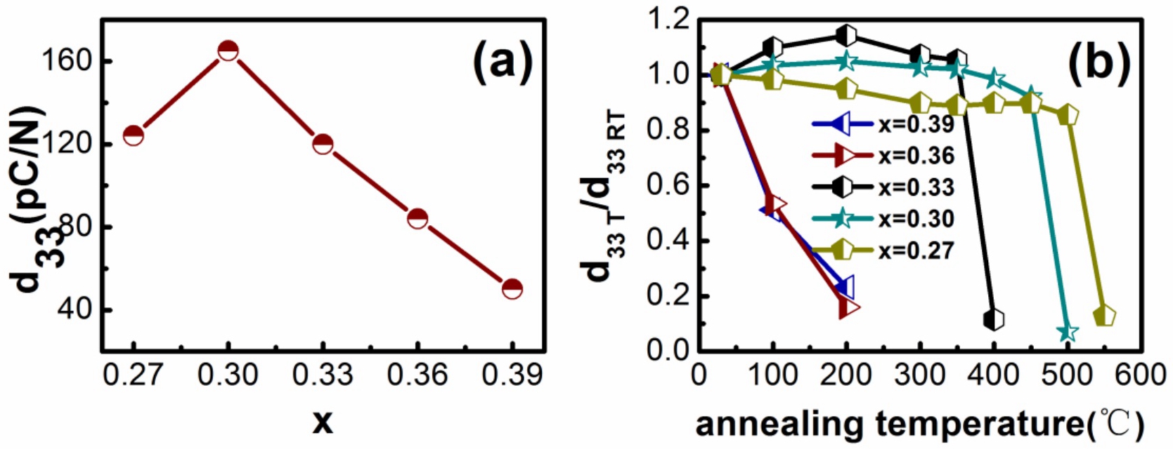 32.Xiaojing Cheng, Jiagang Wu*, Xiaopeng Wang, Binyu Zhang, Jianguo Zhu, Dingquan Xiao*, Xiangjian Wang, and Xiaojie Lou, Giant d33 in (K,Na)(Nb,Sb)O3-(Bi,Na,K, Li)ZrO3 based Lead-free Piezoelectrics with High Tc, Applied Physics Letters, 103, 052906 (2013)