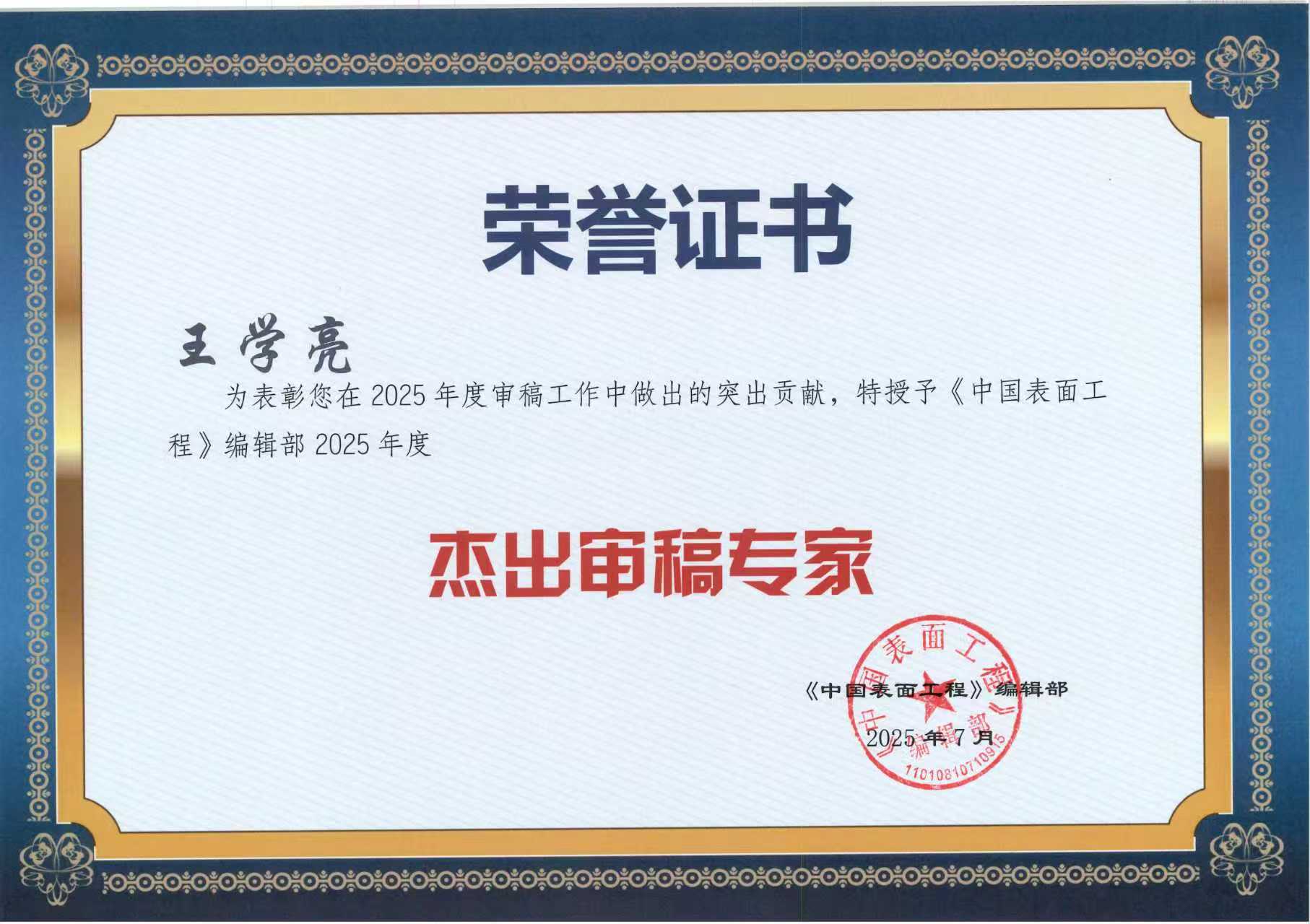 课题组王学亮老师荣获ESCI、EI收录期刊《中国表面工程》2024-2025年度杰出审稿专家荣誉称号