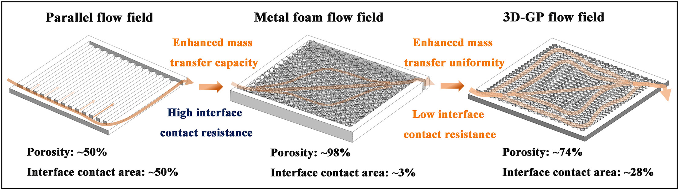 课题组近期在氢燃料电池三维有序多孔流场方面的研究成果发表在国际著名期刊Journal of Power Sources, 该工作针对氢燃料电池流场如平行流场(Parallel flow field)和泡沫多孔流场(metal foam flow field)传质存在的传质不均匀进而引发电流密度、温度等分布不均匀问题,提出构建三维有序孔隙率梯度多孔流场(three dimensional flow field with gradient porosity, 3D-GP)结构,耦合调控孔隙率与单元体拓扑结构实现多孔流场传质损失与界面欧姆损失协同优化,采用数值仿真设计优化与实验性能测试验证相结合,探究了三维有序孔隙率梯度流场结构对氢燃料电池传质性能与电池电化学性能影响规律。该研究成果为提升氢燃料电池传质性能和功率密度提供有效途径。该工作得到了国家重点研发计划项目支持。