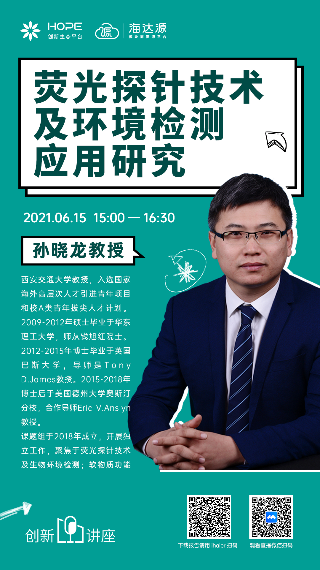 6月17号下午,团队负责人孙晓龙教授应海尔研发部门邀请,为其作了题为“荧光探针技术及环境检测应用研究”的讲座报告。报告从国家对生物医学重大需求的角度出发,为实现精准医学对新的诊断技术的要求,开发分子识别和荧光探针技术,并在生物、环境等方面的检测应用做了详细讲解。这为推动与海尔等高新企业的深入合作,并进一步实现产学研用深度融合打下良好基础。