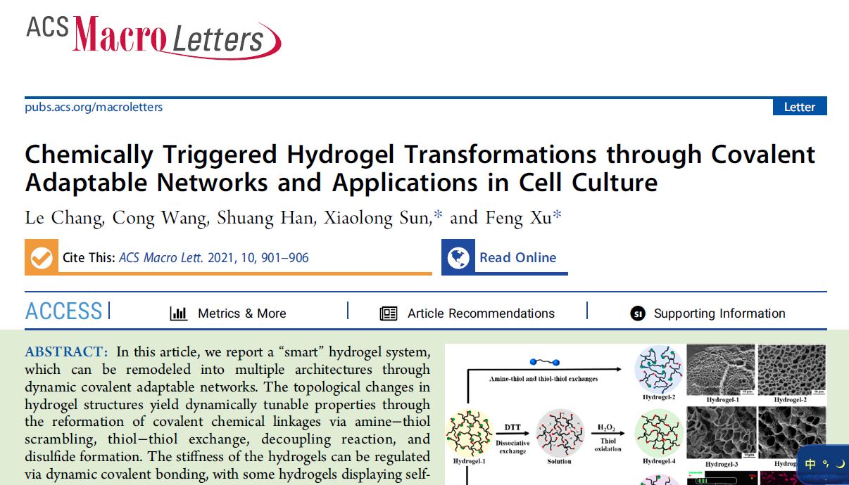 热烈祝贺课题组联合培养博士生常乐和硕士生王聪在水凝胶动态化学键调控方面的研究工作被美国化学会杂志ACS Macro Letter接收发表。