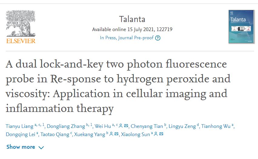 热烈祝贺课题组与西京医院合作研究成果在Talanta接收发表!文章第一作者为联合培养博士生梁天宇和西京医院张栋梁博士,通讯作者为西安交通大学孙晓龙教授、西京医院杨薛康主任和博士后胡伟。