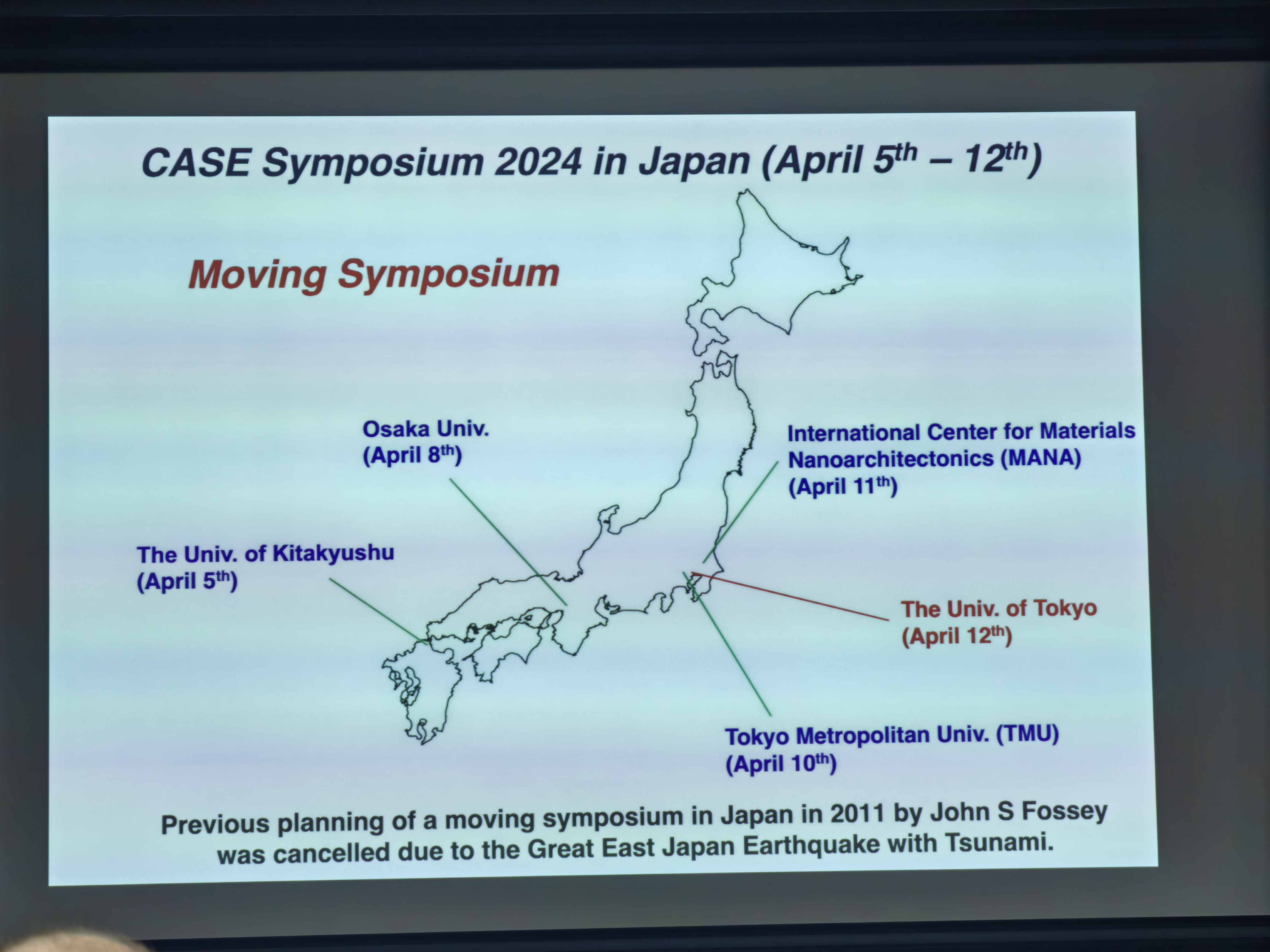 2024. 4. 4 - 12号,由英国巴斯大学教授Tony James教授发起的2024年Catalyst and Sensing for our Environment,简称CASE2024会议在日本举行。会议为纪念CASE发起者英国伯明翰大学逝去的教授John Fossey,与会者走访了The Univ. of Kitakyushu (4.5), Osaka Univ.(4.8),Tokyo Metropolitan Univ.(4.10),International Center for Materials Nanoarchitectinics (MANA) (4.11),The Univ. of Tokyo (4.12)并分别举行了五场学术报告会,分别由日本学者Kazuo Sakurai,Kazuya Yamamura, Yuji Kubo, Jonathan P. Hill和Shu Kobayashi组织。孙晓龙教授参会并做了Indanonalkene Photoluminescent Platform and Applications的学术报告,介绍了课题组开发并提出的茚酮烯光致发光平台及在构建分子探针、生物材料方面的探索,并在环境检测、生物识别-成像、释药体系及可降解聚合物方面的应用。