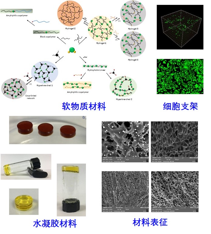 生物材料新技术:通过化学精准合成,开发软物质材料,利用动态共价键调控材料性能;水凝胶材料应用于细胞培养、药物释放;荧光水凝胶材料。