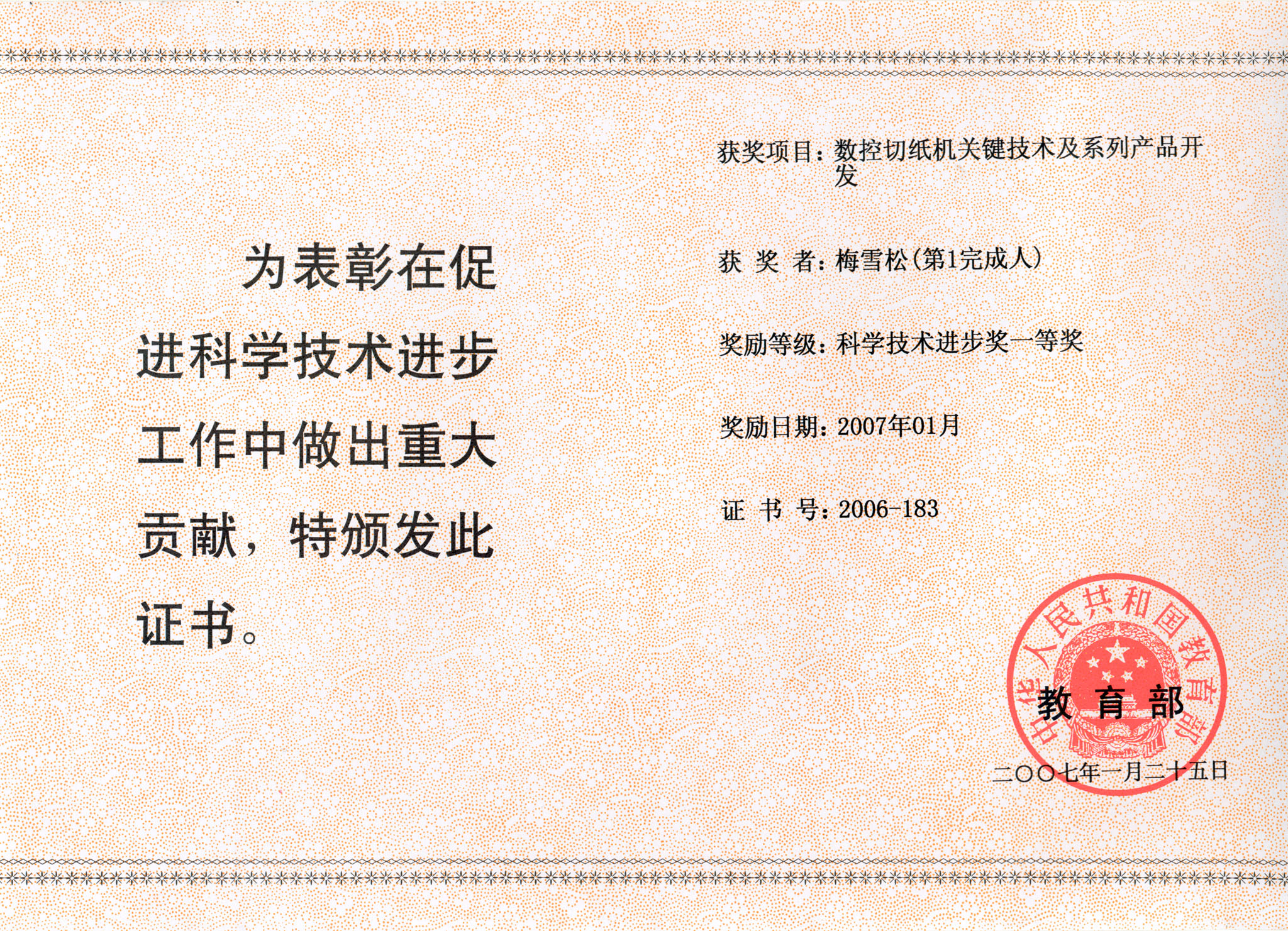 高速高精度数控切纸机关键技术及系列产品开发 2006年度教育部科学技术进步一等奖、教育部 -