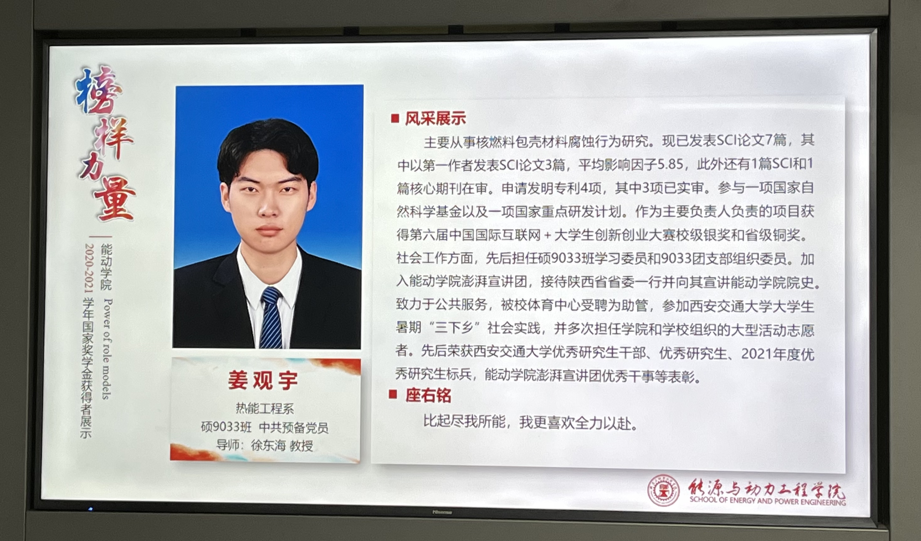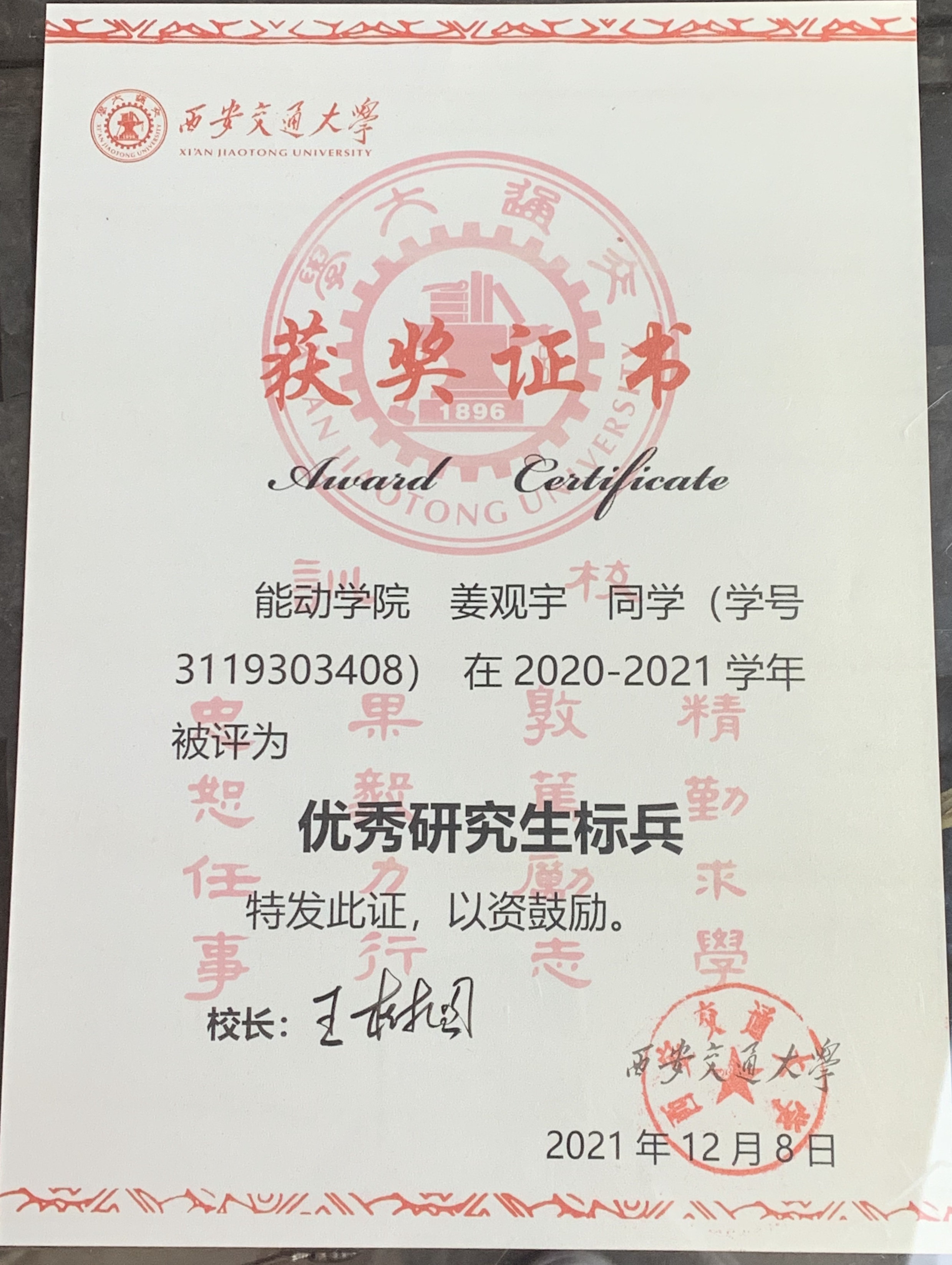 内容: 祝贺课题组研究生姜观宇获得2020-2021学年国家奖学金(全年级第四),西安交通大学2021年度优秀研究生标兵(能动学院唯二硕士)和第十二届学术之星(全校仅10人)