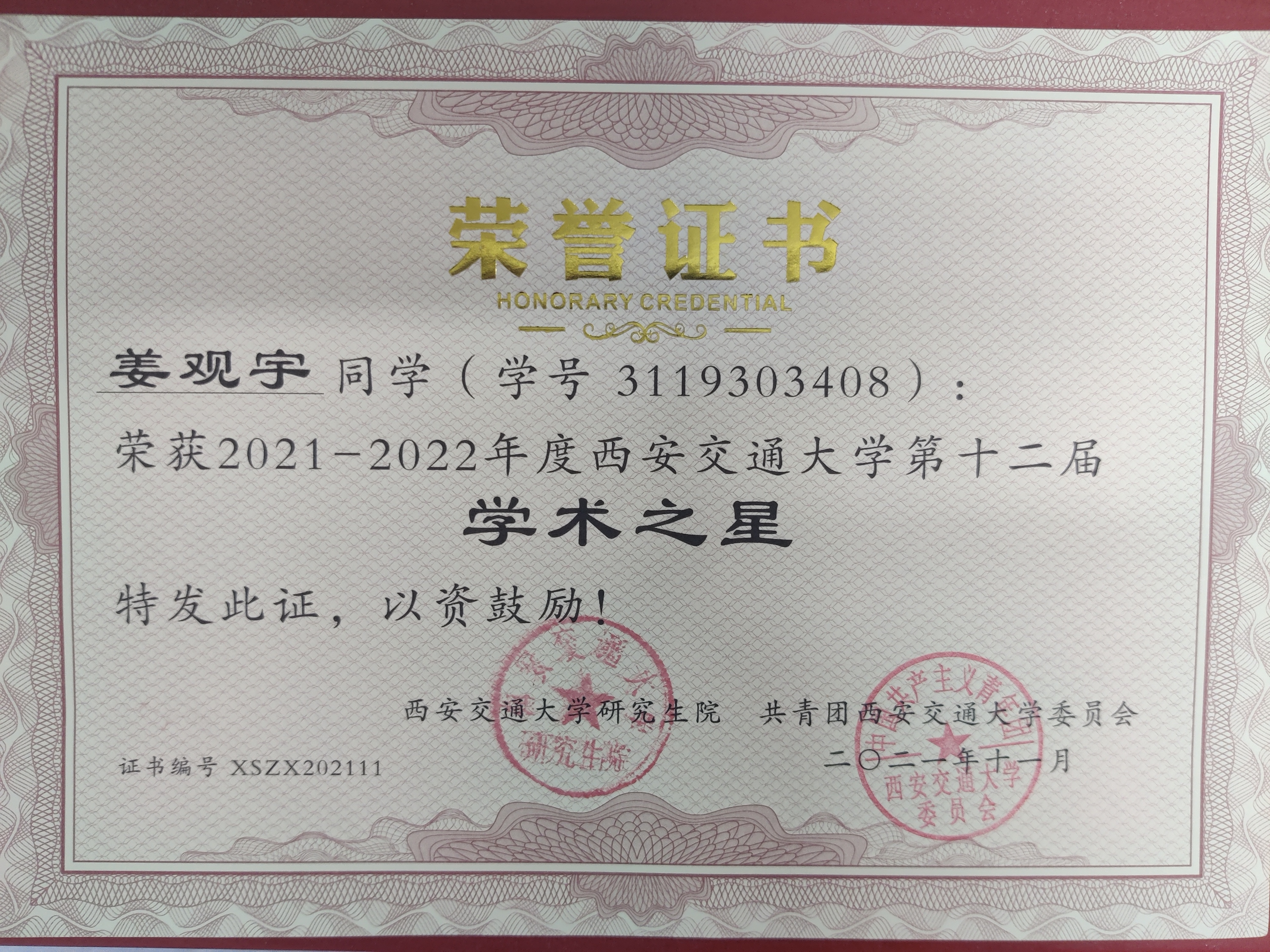 文章标题:硕士生姜观宇荣获国家奖学金,西安交通大学优秀研究生标兵和学术之星