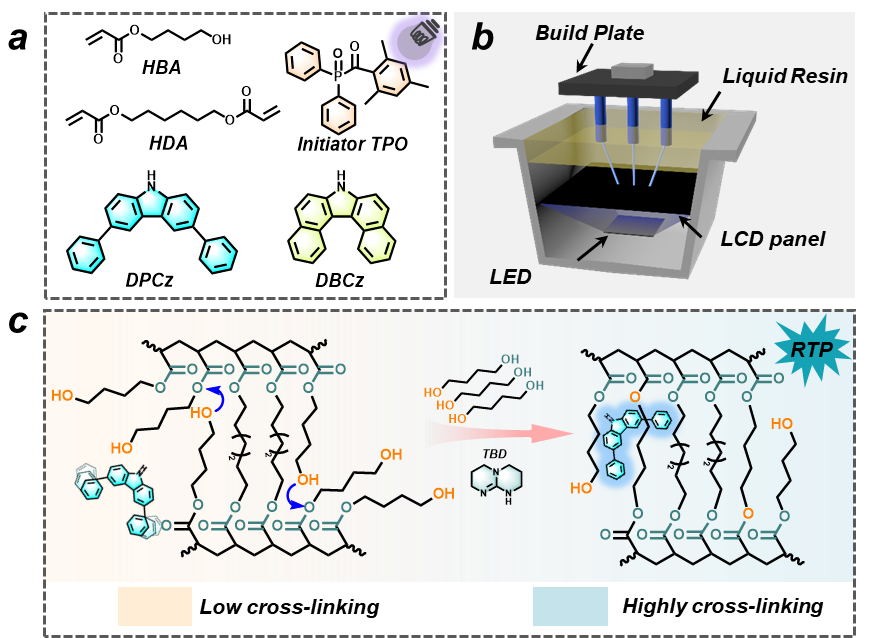 近期,西安交通大学化学学院张彦峰教授团队报告了一种新型按需发射RTP的聚合物材料。如图1所示,在365 nm紫外光辐照下,它们可以进行光聚合,用于3D打印。该材料将纯有机发色团(DPCz、DBCz)掺杂到具有大量游离羟基侧链的聚合物网络中。这种独特的聚合物材料可通过热触发非平衡酯交换反应提高交联度,发色团的热运动受到有效限制,因此可实现按需磷光发射。