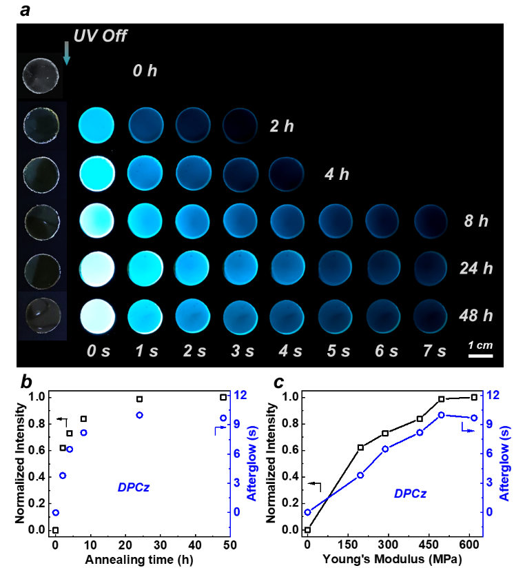图4 HBA-HDA0.2%-DPCz薄膜不同退火时间后的光物理特性。(a)不同退火时间后的磷光照片。(c)不同退火时间和(d)杨氏模量下的磷光强度和余辉。