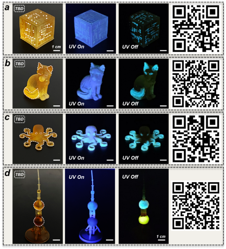 图6 空间区域化激活了3D打印材料的磷光。三维打印(a)立方体、(b)狐狸、(c)章鱼和(d)东方明珠在紫外光照射下和照射后的照片。扫描二维码查看视频。