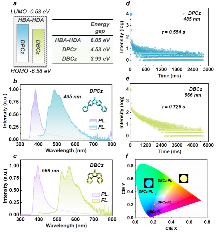 图3 掺杂DPCz和DBCz的HBA-HDA0.2%薄膜的光物理特性。(a)HBA-HDA和发色团的HOMO和LUMO能级。(b)HBA-HDA0.2%-DPCz和(c)HBA-HDA0.2%-DBCz薄膜的瞬时和延迟磷光光谱。(d)HBA-HDA0.2%-DPCz (λem = 485 nm)和(e)HBA-HDA0.2%-DBCz (λem = 566 nm)薄膜磷光发射的寿命衰减曲线。(f)CIE坐标图。