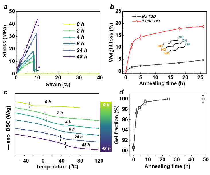 图2 监测硬化过程。HBA-HDA0.2%在150 °C退火不同时间后的(a)应力-应变曲线;(b)含催化剂(TBD)和不含催化剂(TBD)时的重量损失;(d)差示扫描量热(DSC);(d)凝胶分数。