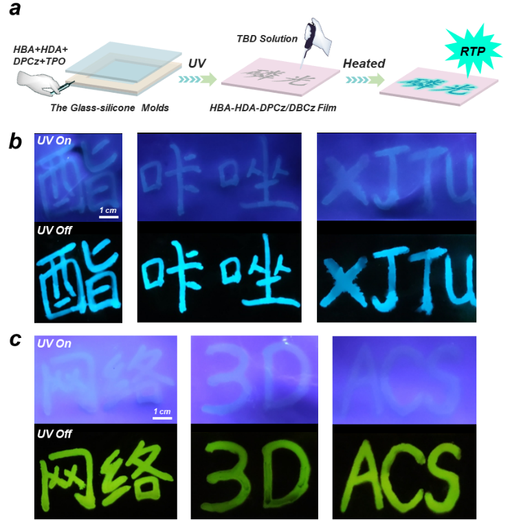 图5 通过非平衡酯交换反应实现图案化磷光。(a)获得区域化磷光的过程。用TBD溶液书写(b)HBA-HDA0.2%-DPCz和(c)HBA-HDA0.2%-DBCz薄膜在紫外光照射前后的照片。