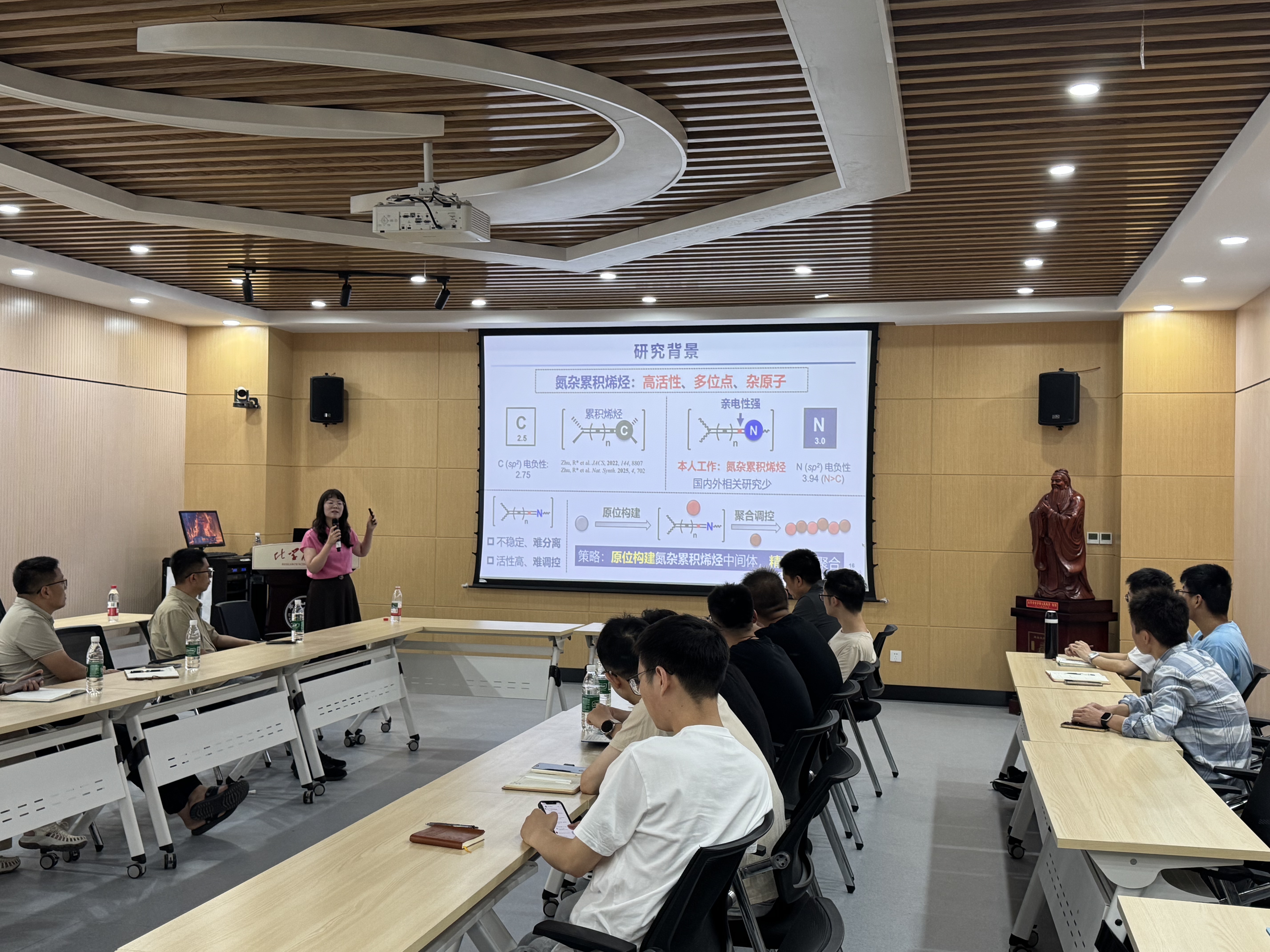 交流伊始,郑楠老师以轻松生动的方式分享了大连的城市魅力。郑老师饶有兴致地介绍了大连宜人的气候、别具特色的城市风景,甚至提到了街道上偶见的梅花鹿,让在场师生对这座海滨城市心生向往。同时,郑老师还热情推荐了大连的地道美食,会场氛围十分愉悦融洽。随后,郑老师进入学术汇报环节,系统阐述了磺酰基氮杂联烯中间体的研究成果。郑老师指出,氮杂联烯中间体因其兼具高反应活性和杂原子生物医用功能化潜力,在高分子化学与生物材料交叉领域具有重要研究价值,其中重点介绍了两大核心内容:一是通过聚合原位构筑磺酰基氮杂联烯,实现多样性导向的精准聚合;二是基于该中间体开发智能响应型磺酰基生物医用高分子,为在场师生呈现了该领域的前沿动态与研究思路。