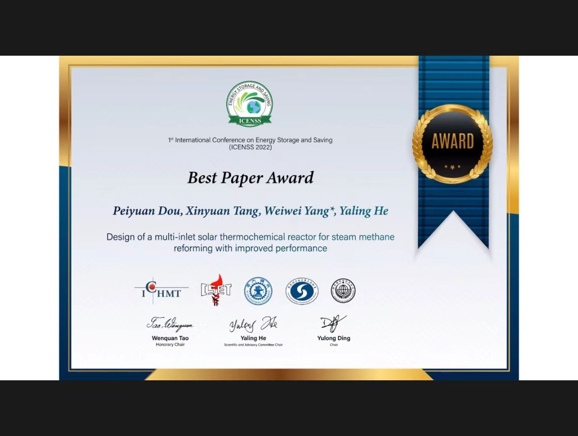 [2] P.Y. Dou, X.Y..Tang, W.W. Yang*, Y.L. He, Design of a multi-inlet solar thermochemical reactor for steam methane reforming with improved performance. 2022, 1st International Conference of Energy Storage and Saving, Xi'an, China.