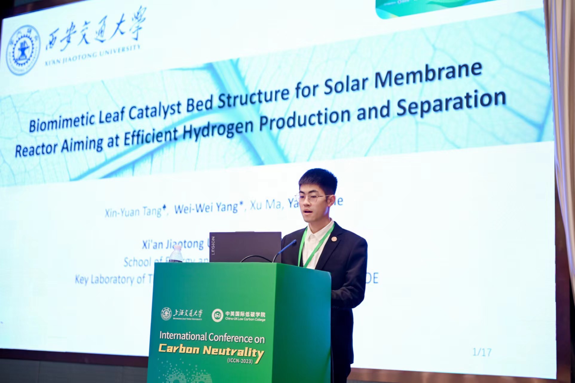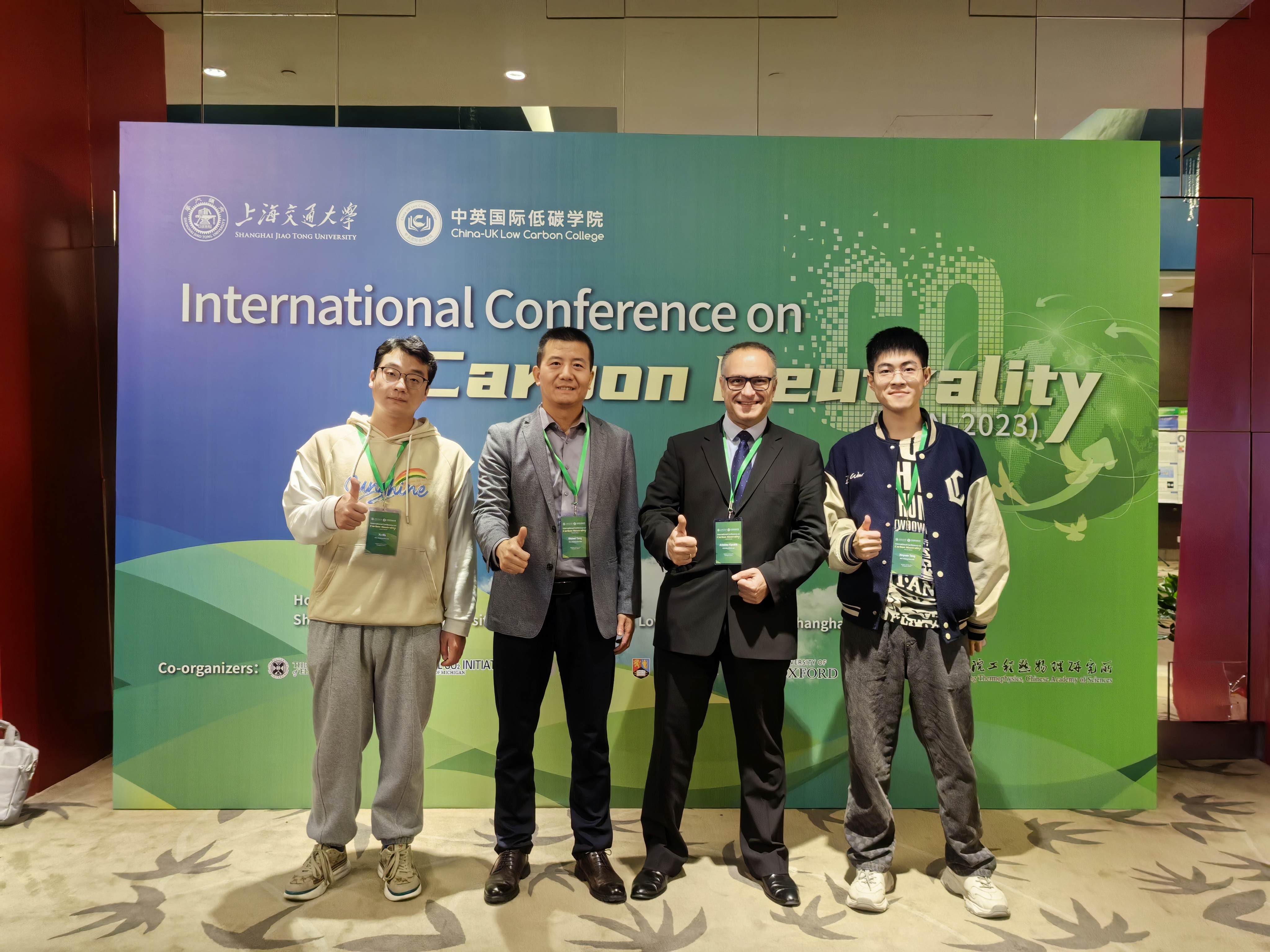 2023年10月20-23日,课题组成员前往上海参加碳中和国际学术会议(ICCN-2023)。会议由上海交通大学联合英国爱丁堡大学、美国密歇根大学(Global CO2 Initiative)、清华大学、中国科学院工程热物理研究所、英国伯明翰大学、英国牛津大学等世界一流高校和科研院所共同举办。会议支持的碳中和(Carbon Neutrality)期刊由上海交通大学和Springer Nature于2021年发起,旨在实现全球碳中和的目标。国内外多名院士及专家学者从不同层面针对碳中和问题进行了演讲。 参会过程中,课题组负责人与中科院工程热物理研究所Prof. Xinjing Zhang共同担任了Advanced Energy Storage分会场主席并主持会议。博士生唐鑫源与马旭分别作了“Biomimetic Leaf Cata-lyst Bed Structure for So-lar Membrane Reactor Aim-ing at Efficient Hydrogen Pro-duction and Separation”和“Performance characteriza-tion of methane-as-sisted carbon dioxide reduc-tion on Ce-doped Ni-Al2O3 catalytic system”口头报告,分享了课题组高效温和太阳能热化学制氢研究的相关工作进展。