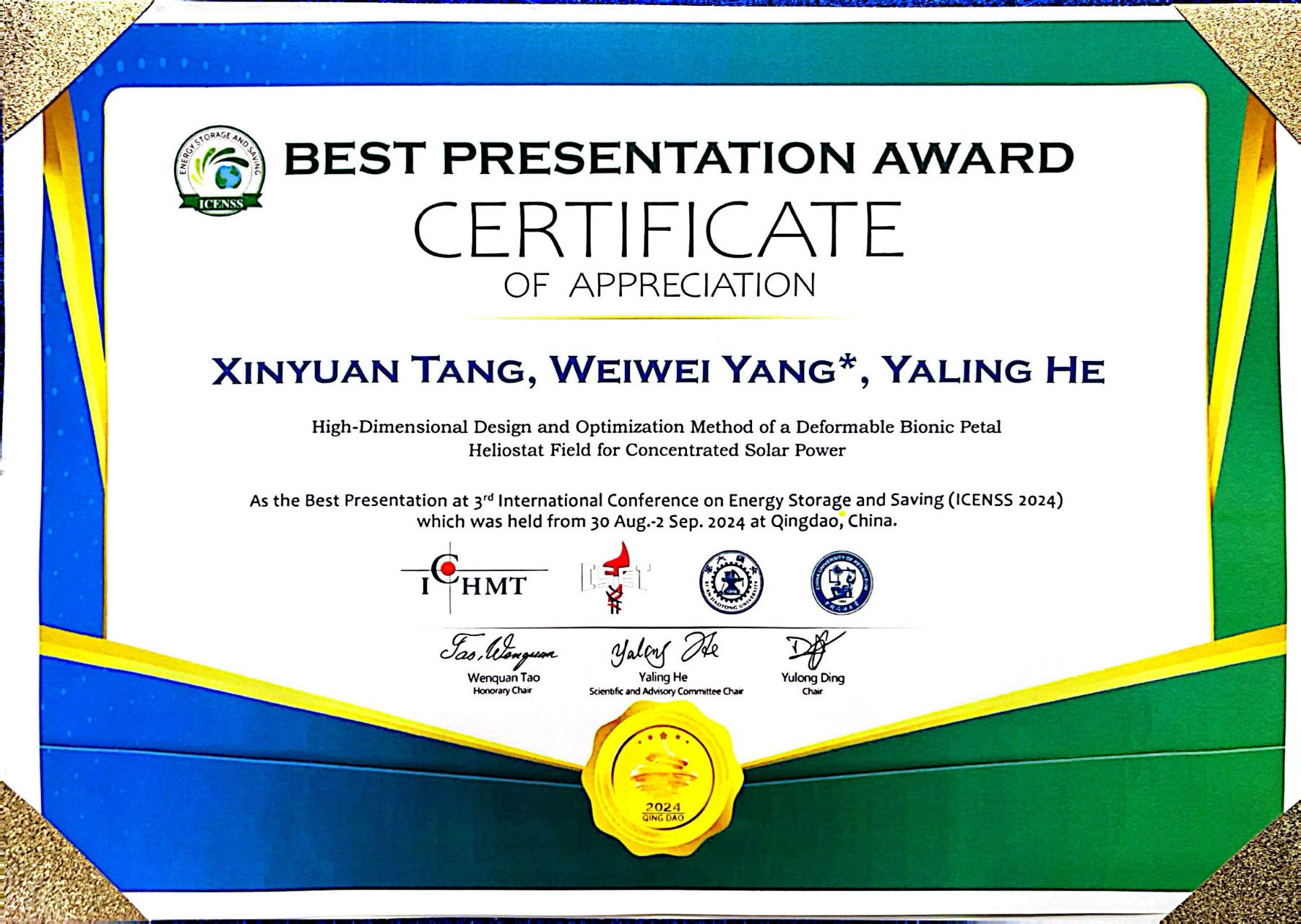 与会过程中,研究生唐鑫源和李梦飞分别作了英文口头报告:“High-dimensional design and optimization method of a deformable bionic petal heliostat field for concentrated solar power”和“Multi-objective optimization of hybrid battery thermal management design with considering thermal runaway propagation prevention”。分享了课题组塔式太阳能热电站定日镜场和锂电池热失控管理研究的相关工作进展,并与国内外学者们进行了深入讨论交流。会议中,博士生唐鑫源以可变形仿生花瓣定日镜场的设计及优化工作的汇报获得Best Presentation Award。
