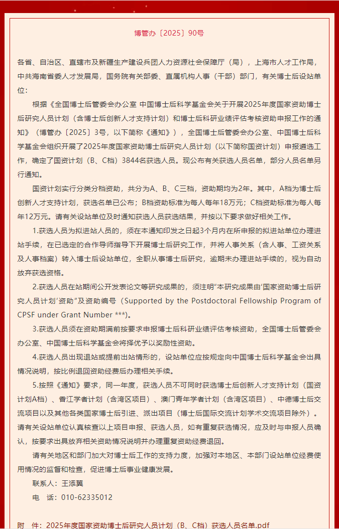 祝贺课题组唐鑫源博士、 李伟卓硕士分别获批2025国家资助博士后研究人员计划B类、C类。