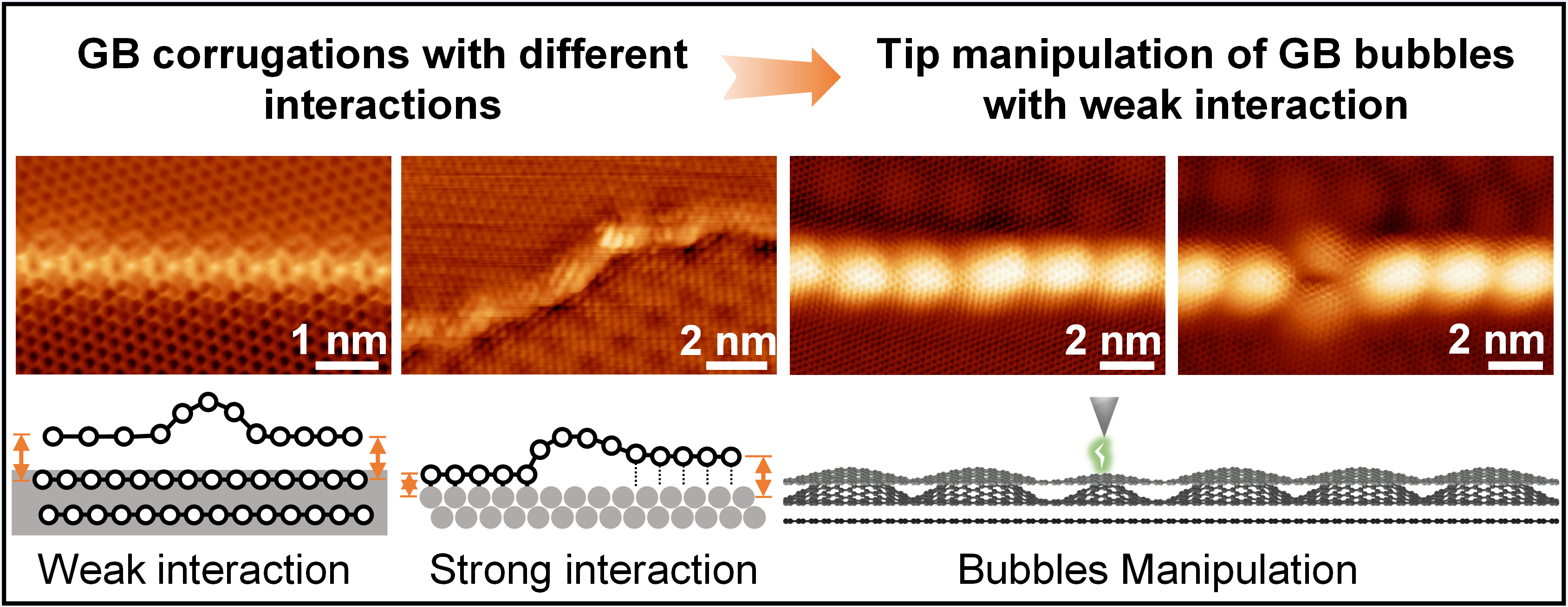 内容: https://doi.org/10.1016/j.carbon.2025.120890 我们以STM针尖作为原子级应变调控的工具,实现了多晶石墨烯畴界鼓泡的可控翻转。 •Atomic observation of misorientation-angle-dependent GB corrugations in polycrystalline graphene on vdW substrates. •Reversible buckling polarity manipulation of bubble-like corrugations realized by STM manipulation. •Symmetric and asymmetric cross-sectional profiles of GB wrinkles observed on vdW and metallic substrates, respectively. •An asymmetric strain distribution mechanism is proposed to explain the influences of intra- and inter-layer interactions. The nanoscale corrugations, which endow atomically thin two-dimensional materials with unique physical and chemical properties, universally exist in the grain boundary (GB) of polycrystalline graphene, but their structural tunability and the influence of substrate interaction require further investigation. Here, we report the atomically resolved scanning tunneling microscope observation and manipulation of GB corrugations in polycrystalline graphene with different substrate interactions. On the van der Waals (vdW) substrate graphite, the structure of the GB corrugation is dominated by intra-layer interaction arising from the misorientation between neighboring grains. It evolves from periodic bubble-like corrugations to continuous wrinkles as the misorientation angle increases. The buckling polarity of the surface and subsurface bubble-like GB corrugations on vdW substrates can be reversibly manipulated by applying an electric field through the STM tip. While on the metallic substrate Pt(111), the GB wrinkles show asymmetric cross-sectional profiles due to combined intralayer interactions from neighboring grains and interlayer interactions from the substrate. The metallic substrate also provides pinning effect preventing the buckling polarity manipulation. Additionally, a strain distribution mechanism was proposed to explain the influence of the key factors. These findings shed light on the strain engineering of graphene corrugations, which might find applications in electronic devices. This work was done by Xueyan Li (李雪妍 Ph.D candidate) and Jiaqi Yang (杨嘉琪 Master candidate).