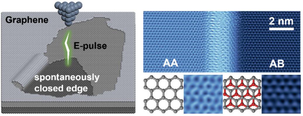 内容: https://pubs.acs.org/doi/10.1021/acs.nanolett.5c04158 The electronic transport properties of nanoscale patterned graphene are significantly influenced by its edge structures. Herein, we report a self-healing phenomenon of freshly torn bilayer graphene edges based on in situ scanning tunneling microscopy observations. The fresh bilayer edges are created in the surface graphene layers by tip-induced field evaporation. Surprisingly, atomic resolution images reveal the spontaneous formation of a half-tubular structure that seamlessly connects the upper and lower layers, identical to the edge of a folded monolayer graphene. It is attributed to a self-healing mechanism of open bilayer edges in aligned zigzag (or armchair) direction, where the transient edge carbon radicals evolve into sp2 hybridized C-C bonds between neighboring layers. For armchair edges, the original AB stacking can be locked into the AA stacking due to required sliding of carbon atoms. This finding opens up an atomic precision edge engineering method of patterned graphene for devices. 我们以STM针尖作为原子级制造的工具,实现了超高真空极低温条件下基于场蒸发效应的石墨烯边界切割,并在新制备的双层的zigzag和armchair边界上发现了出乎意料的自发缝合现象,即上下两层边缘碳自由基自发键合形成完美无悬键的半管状封闭结构。其中armchair边界的自缝和还会因一个键长的滑移形成锁定的AA双层堆垛结构。这些发现为不受边缘态影响的高质量石墨烯纳米器件未来原子级制造提供了一种新机制。 This work was done by Xueyan Li (李雪妍),who is currently a Ph.D candidate.