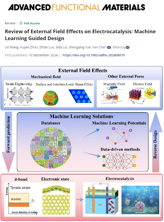 近日,西安交通大学航天航空学院刘益伦教授团队在国际知名期刊《Advanced Functional Materials》发表了一篇关于应变调控电催化及机器学习指导催化剂设计的综述报告。该综述阐述了基于外场调节的活性增强机制,介绍了外场调控对催化剂电子结构及催化性能的影响。此外,该文简要回顾了新兴机器学习技术在电催化设计中的应用,包括模拟大规模和动态化学反应过程的机器学习原子间势,数据驱动的电催化性能设计和优化。最后,该综述强调了机器学习技术与外场调节相结合的巨大潜力,是优化或逆向设计电催化剂的有效工具,并且同时考虑热力学和动力学因素以及极端外场下电催化剂表面的动态效应。