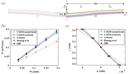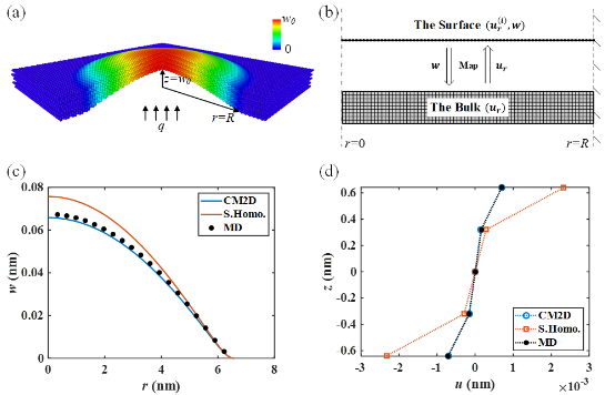 对此,本文提出以下连续介质模型(图 2):首先将各片层看作连续体,其弯曲刚度独立于面内变形刚度;将片层之间的范德华相互作用替换为等效介质。它们的参数均可由分子动力学模拟给出。随后,对内层作均质化,得到体相本构;剩余的最外侧片层则保留为表面层,它们之间通过应力连续条件进行耦合。最后,表达出各部分虚功,借助虚功原理得到平衡方程及所需边界条件。如,