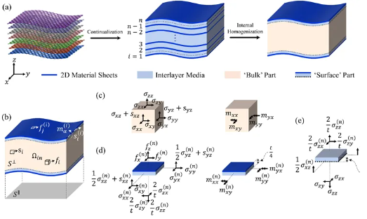 然而,由于其层状的晶格结构、极端各向异性以及离面弯曲的独立变形机制等特点,这类材料的均质化力学模型目前仍面临挑战。有别于经典材料,二维材料单片层的弯曲变形机制显著区别于其面内变形机制,导致描述其体相材料的力学行为时必须引入偶应力的概念。此外,表面片层与内部片层因约束状态不同,使整体表现出显著的表面层效应。目前还缺乏同时考虑单层弯曲效应和表面层效应的二维材料连续介质力学框架。