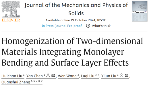 近日,西安交通大学航天航空学院刘益伦教授团队以“Homogenization of Two-dimensional Materials Integrating Monolayer Bending and Surface Layer Effects”为题,在固体力学旗舰刊物《Journal of the Mechanics and Physics of Solids》上发表了一篇研究论文,针对极端各向异性二维材料提出一种均质化的连续介质力学框架。该工作不仅可为二维材料的研究和应用提供指导,也可为高阶连续介质力学模型中的应变梯度、偶应力、高阶模量等概念提供具体的物理图像。