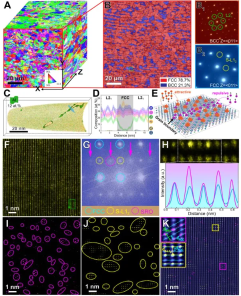 图1. SS-合金的结构。(A) 三维EBSD反极图(IPF)。(B)为(A)中方形区域的相分布图,显示FCC-BCC双相结构。(C) 三维重构APT数据集。(D)为(C)中箭头所示区域的成分图。(E) MD计算结果示意图,显示SRO和S-L12颗粒分别在晶界附近偏聚和晶粒内部析出。(F) FCC相的HAADF-STEM图。(G)为(F)的FFT图。(H)为(F)中绿色虚线矩形区域放大的HAADF-STEM图。(I)和(J)分别对应(G)中SRO和S-L12弥散圆盘和衍射斑点的IFT图。(K) 利用(G)中FCC、SRO和S-L12的弥散圆盘和衍射斑点叠加的IFT图。