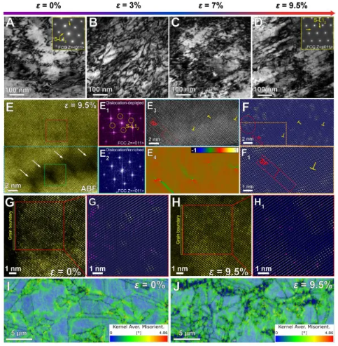 图3. SS-合金中FCC相在拉伸过程中的结构演变。(A-D) FCC相在不同拉伸应变下的明场TEM图,显示了位错和层错的演变。(E) FCC相在9.5%拉伸应变下的ABF- STEM图。(E1和E2) 分别从(E)中红色和绿色方形区域得到的FFT图。(E3)为(E)中位错富集区放大的HAADF-STEM图。 (E4) 为(E3)基于GPA的对应应变图。(F) 为(E3)生成的叠加IFT图,显示位错/层错与S-L12相之间的交互作用。(F1)为(F)中虚线矩形区域的放大图。(G) FCC区域未变形状态下晶界附近的HAADF-STEM图。(G1)为(G)中红色方形区域生成的叠加IFT图,显示SRO在晶界附近偏聚。(H) FCC区域经过9.5%拉伸应变后的HAADF-STEM图。(H1)为(H)中红色方形区域生成的叠加IFT图。变形后,SRO在晶界附近以及晶粒内的分布是均匀的,表明位错的运动破坏了原本在晶界附近的SRO,使其发生有序向无序转变。(I) 拉伸前SS合金的KAM图,显示应力主要集中在晶界附近,这是由于短程序在晶界附近偏聚造成的,对屈服强度的提升有较强作用。(J) 拉伸后SS合金的KAM图,晶界附近和晶粒内部的应力集中情况类似,即应力非局域化,有利于维持均匀塑性变形。