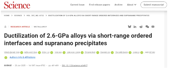 超高强度和优异的拉伸塑性是结构材料发展的不懈追求。然而,合金的抗拉强度提升至超高水平后(如>2.5 GPa),通常难以维持良好的应变硬化能力。因此,此类超强合金的均匀延伸率往往难以突破5%应变。近日,西安交通大学航天航空学院刘思达教授与西安交通大学吴戈教授、刘畅教授,联合香港城市大学吕坚院士,设计了一种创新纳米结构,即短程有序界面与超纳析出相的结合,来克服此难题。该研究成果以“Ductilization of 2.6-GPa alloys via short-range ordered interfaces and supra-nano precipitates”为题发表在《Science》上。