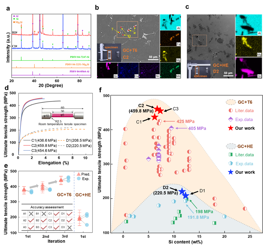 图4. 高强度铝硅合金的实验验证与力学性能。(a) X射线衍射(XRD)图谱。(b-c) 对合金C2(GC + T6工艺路径)和D2(GC + HE工艺路径)进行扫描电子显微镜-能谱分析(SEM-EDS)。(d) 从GC + T6和GC + HE工艺路径中选择的高强度合金的应力-应变曲线。(e) 对GC + T6工艺路径进行三轮迭代预测与验证精度评估,以及GC + HE工艺路径进行单次迭代的评估。(f) 将文献数据、先前实验结果与本研究开发的高强度铝硅合金在GC + T6和GC + HE工艺路径下的抗拉强度(UTS)与硅含量进行比较。