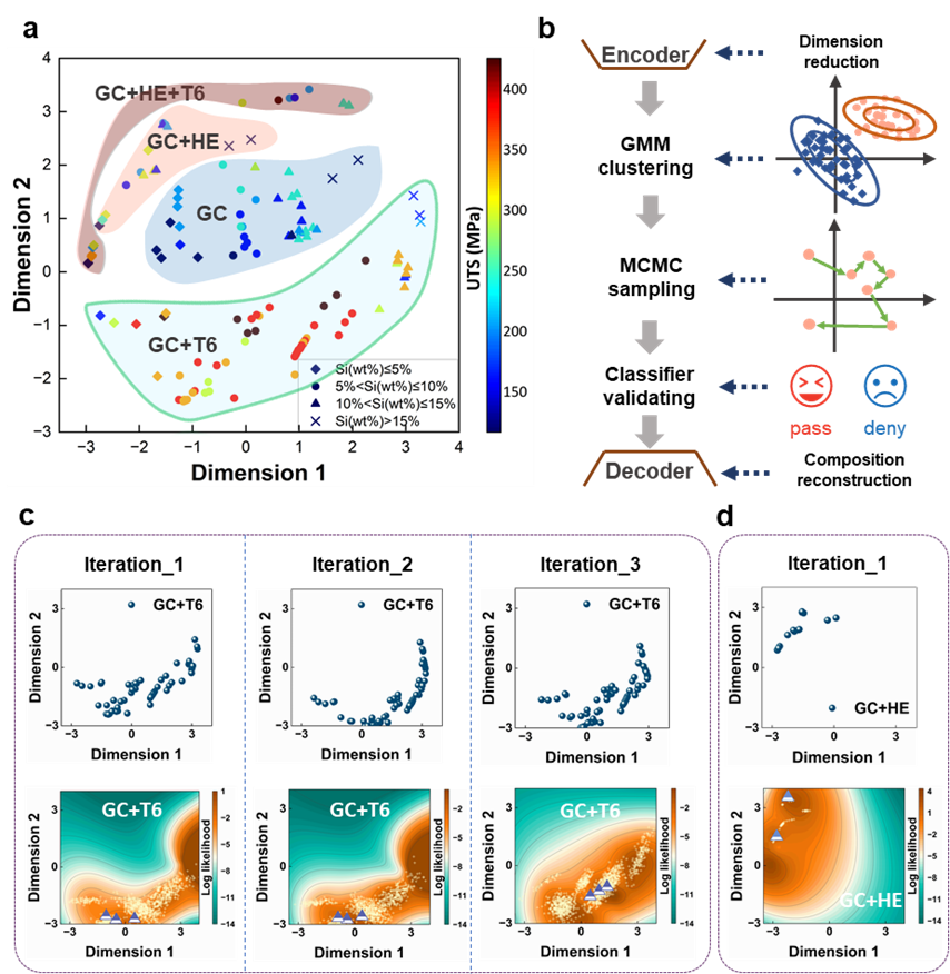 图3. 基于工艺的潜在空间分析与采样。各面板展示了潜在空间如何引导特定工艺的采样与优化。(a) 在基于工艺的潜在空间中展示合金成分的可视化,不同的簇代表不同的工艺方法,数据点按抗拉强度(UTS)值进行颜色编码。符号形状表示不同范围的硅含量。(b) 对于指定的工艺路径(以GC + T6为例),在成分潜在空间中的采样流程。(c) 通过三次迭代周期进行渐进优化,展示GC + T6工艺路径下潜在空间的演化及高斯混合模型(GMM)概率密度图的精细化,逐步逼近高强度合金成分。(d) 对于GC + HE工艺路径的加速优化路径,在仅一次迭代中就实现了高强度合金成分的得到。