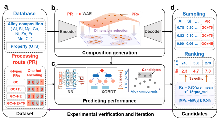 图1. 工艺协同主动学习框架概述。该框架主要包括以下几个组成部分:(a) 通过整合实验数据与文献中衍生的成分-工艺-性能数据构建数据库,涵盖了除铝和硅之外的七种主要合金元素,并采用独热编码方式表示工艺路径(PRs)。(b) 利用条件Wasserstein自编码器(c-WAE)架构生成特定工艺的合金成分潜空间。(c) 实施基于工艺路径和合金成分的集成代理模型进行性能预测。(d) 系统性地选择排名靠前的合金成分进行实验验证,并通过迭代数据库丰富与模型优化,直到找到高强度合金。