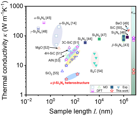 图4. 典型陶瓷与Si3N4共格异质结构在不同尺度下的热导率对比。