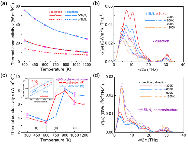 图5. (a)β-Si3N4和α-Si3N4沿x方向和z方向的热导率随温度的变化关系。(b)温度对β-Si3N4和α-Si3N4光谱热导的影响。(c)α/β-Si3N4共格异质结构沿x方向和z方向的热导率随温度的变化关系。(d)温度对α/β-Si3N4异质结构光谱热导的影响。