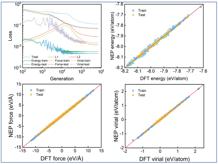 图2. NEP模型预测值与DFT参考值的对比。