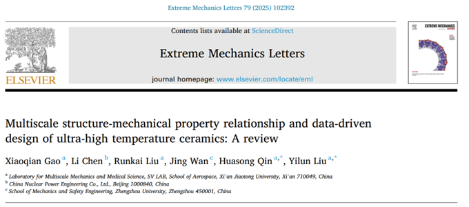 近日,西安交通大学航天航空学院刘益伦教授团队在国际知名期刊《Extreme Mechanics Letters》发表了一篇关于《Multiscale structure-mechanical property relationship and data-driven design of ultra-high temperature ceramics: A review》的综述论文。该综述系统阐述了超高温陶瓷(UHTCs)的多尺度结构-力学性能关系及数据驱动设计进展,并分别从纳观尺度、微观尺度和介观尺度剖析了多层级结构的高温微结构演化和失效行为及强韧化策略。并进一步讨论了数据驱动方法对UHTCs性能的高效预测与结构优化进展。最后,提出了多层级结构调控策略实现UHTCs高强高韧的展望。