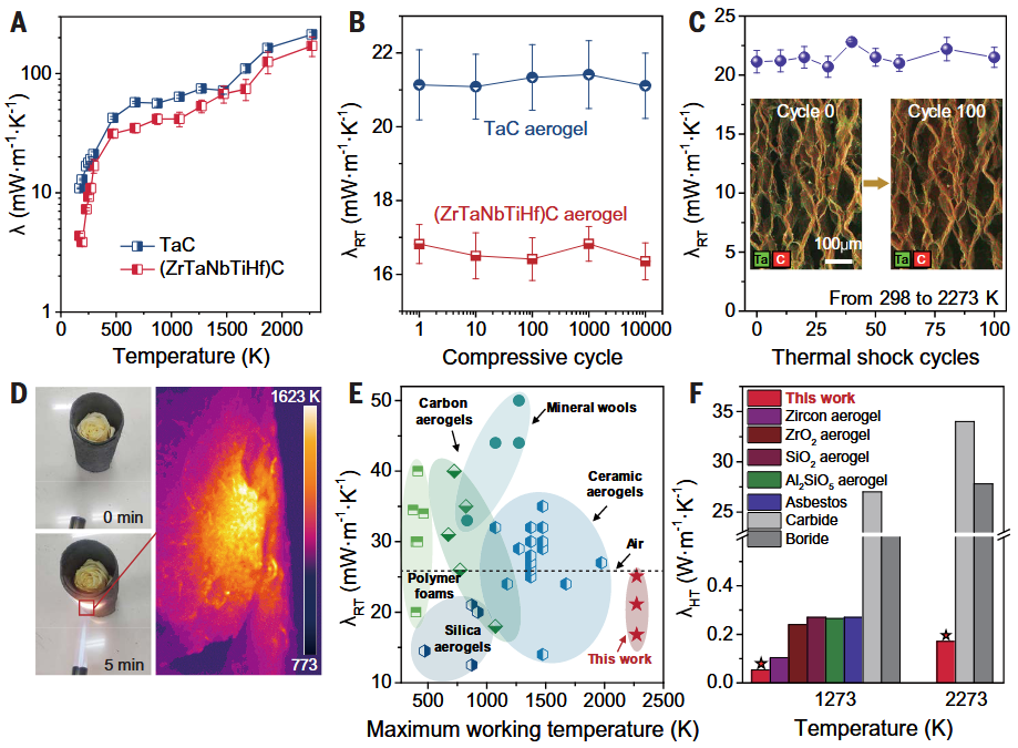 图4. 碳化物气凝胶的热绝缘性能表征。(A) TaC与高熵(ZrTaNbTiHf)C气凝胶在173 K至2273 K范围内的热导率变化曲线;(B) TaC与高熵(ZrTaNbTiHf)C气凝胶在室温下经历99%应变压缩循环10,000次后的热导率;(C) TaC气凝胶在2273 K下热冲击条件下,经过100次循环后的热导率,其中插图为TaC气凝胶的微观结构及元素分布图;(D) TaC气凝胶用于高温热防护场景的实物照片及其对应热成像图像;(E)碳化物气凝胶(包括TaC、ZrC与高熵(ZrTaNbTiHf)C)与典型绝热材料的最大工作温度及室温热导率对比图;(F)碳化物气凝胶在1273 K与2273 K下的热导率与已报道陶瓷材料的对比图。