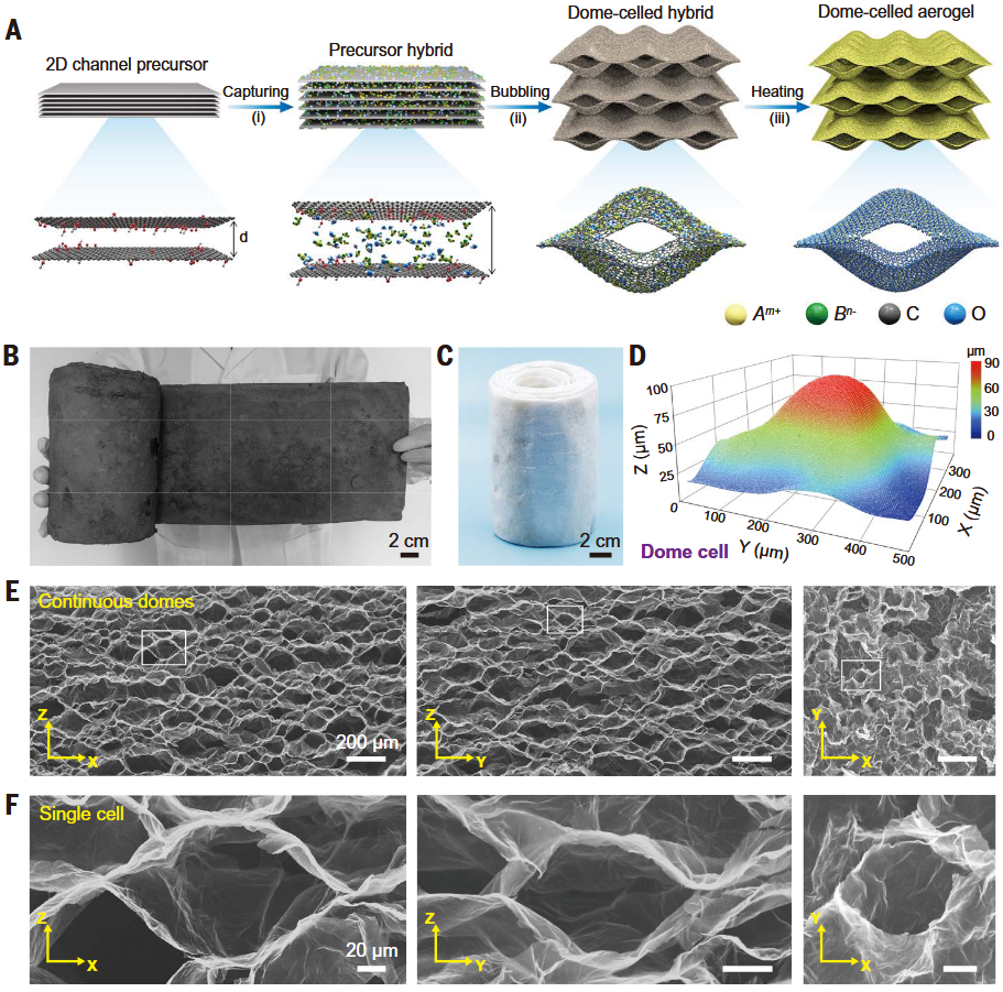 图1. 基于石墨烯二维通道限域方法的穹顶微结构气凝胶构筑。(A) 气凝胶的制备过程包括三个关键步骤:① 通过可调控的氧化石墨烯(GO)限域通道定向捕获金属盐离子;② 利用含发泡剂的溶剂诱导鼓泡,构建穹顶微结构;③ 经热转化处理,在空气中于600 °C加热4小时、氩气中于2000 °C加热2小时,或氢气中于450 °C加热1小时,分别得到氧化物、碳化物与金属气凝胶。(B, C) 所制备碳化物气凝胶板材与氧化物气凝胶卷材的实物图像。(D) 基于厚度约500 nm的超薄GO膜鼓泡形成的穹顶微结构的三维光学图像。(E, F) 穹顶气凝胶在X-Z、Y-Z和X-Y三个方向切片后的扫描电子显微镜(SEM)图像,揭示其各向异性的三维结构特征。