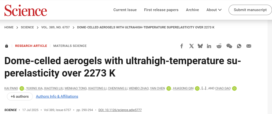 - 研究进展 | Science:耐高温气凝胶超弹性设计与可控构筑