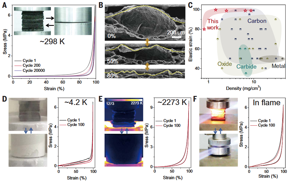 图3. 穹顶胞元气凝胶的力学性能分析。(A) 不同组分的穹顶微结构气凝胶堆叠样品在室温下经历99%应变循环20,000次的压缩应力-应变曲线;(B) 原位SEM结果显示的气凝胶垂直截面压缩结构演化;(C) 穹顶微结构气凝胶最大可恢复应变与表观密度的关系,并与典型已报道气凝胶性能进行对比;(D, E) 不同碳化物穹顶气凝胶堆叠样品在4.2 K与2273 K下,经历99%应变循环100次的应力-应变响应曲线;(F) 碳化物气凝胶堆叠样品在丁烷火焰双侧加热下,经历99%应变循环100次的应力-应变响应曲线。插图为循环加载过程中的代表性实验图片。