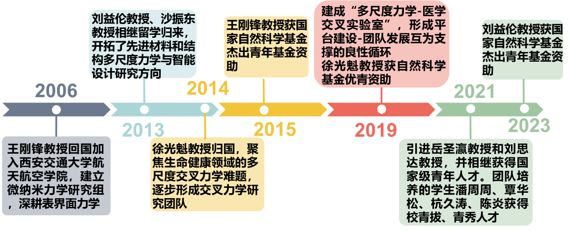 锚定高端人才递进式贯通和平台支撑体系建设是交叉力学团队实现可持续发展的不竭动力和重点所在。2006年,王刚锋教授回国加入西安交通大学航天航空学院,发展了微纳米力学研究方向,深耕表界面力学,并于2015年获国家杰出青年基金资助。2013年,刘益伦教授、沙振东教授相继留学归来,开拓了先进材料和结构多尺度力学与智能设计研究方向。2014年,徐光魁教授从德国马普所留学归国,聚焦生命健康领域的多尺度交叉力学难题,开展一系列交叉力学与生物力学研究。团队成员以学术兴趣为纽带,通过有组织科研和项目牵引,逐步形成了交叉力学研究团队。2019年在中国西部创新港建立“多尺度力学-医学交叉实验室”,强化平台支撑作用,强调个人兴趣和科研公关相统一,形成了“有组织科研+自由探索”相结合的科研生态。得益于平台和团队支撑,团队成员进入发展快车道,刘益伦教授2018年获万人计划青年拔尖人才,2023年获基金委杰出青年基金资助,徐光魁教授2021年获基金委优秀青年基金资助,沙振东教授连续五年入选世界排名前2%科学家排行榜(2019-2023)。秉承“引育并重”的建设理念,形成了平台建设-团队发展互为支撑的良性循环,2021年和2022年分别引进岳圣瀛教授和刘思达教授,相继获得国家级青年人才。团队培养的学生潘周周、覃华松、陈炎获得校青拔、青秀人才称号。交叉力学研究团队以“精神传承为根基、交叉平台为枢纽、前沿创新为引擎”,逐步形成了学术传承有序、学科背景多元、创新思维活跃的新一代研究生导师队伍。