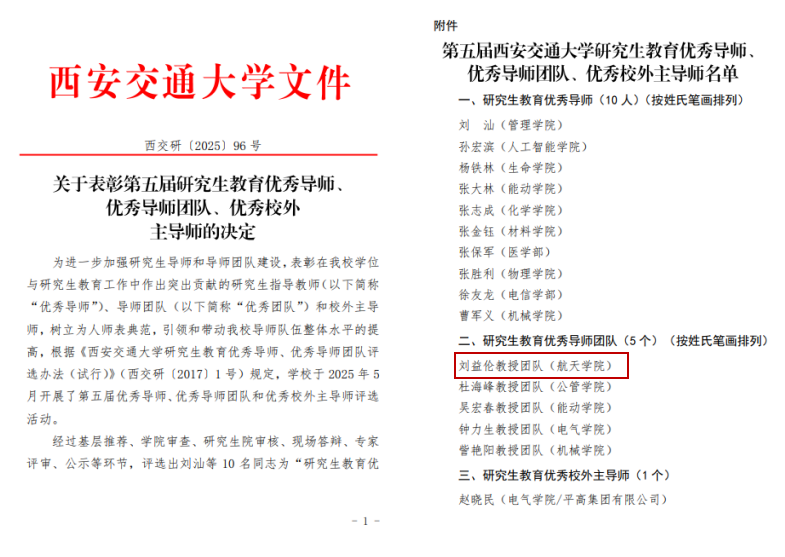 近日,西安交通大学第五届研究生教育优秀导师、优秀导师团队、优秀校外主导师评选结果揭晓,航天航空学院刘益伦教授领衔负责的交叉力学团队荣获2025年西安交通大学“优秀导师团队”(全校唯5)。
