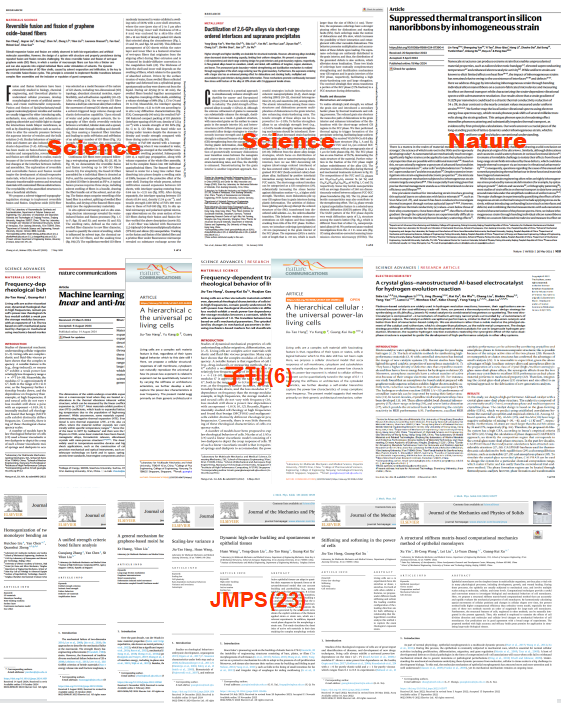“专一不单一”、多维多向交叉、打造优良科研生态是促进交叉力学团队原始创新的“关键一招”和有力保障。团队将先进的力学、材料科学、人工智能等前沿科技深度融合于医疗诊断、精准治疗及健康管理之中,力求开发出更加精准、高效、人性化的医疗解决方案。通过跨学科的合作与创新,能够不断突破医疗技术的瓶颈,为人类的健康福祉贡献智慧与力量。在微纳米力学与接触摩擦方面,团队发展了一个分析纳米器件弹性行为的 “Wang-Feng model”, 已成为该领域的主要模型之一,系统研究了表面效应对断裂、接触和弹性波散射的影响,发展了一个新的粗糙表面接触模型,用于预测压力和真实接触面积的关系,相较于已有模型更加简单准确。在非晶合金结构增韧设计方面,揭示了非晶合金的循环变形与疲劳破环机理,深入开展了高熵合金反应动力学研究,推动了无序合金材料的理论研究及实际应用。在医工交叉领域,团队凝聚力学与临床医学的顶尖力量,与交大二附院共建医工交叉创新团队,以“力学驱动医学革新”为使命,聚焦生命健康领域的多尺度交叉力学难题,首次揭示了细胞与组织普遍的粘弹性标度律响应机理,创新性地提出了病变进程精准评估的力学新指标,将力学、智能材料、人工智能等前沿技术与医疗实践深度耦合,构建了“力学理论-实践-临床”交叉创新体系。团队紧密围绕国际科技前沿与人民生命健康,在力学与智能材料、医学等交叉领域取得系列突破性进展。近5年,持续在Science、Nature、Nat. Commun.、Sci. Adv.等顶级期刊发表论文400余篇。