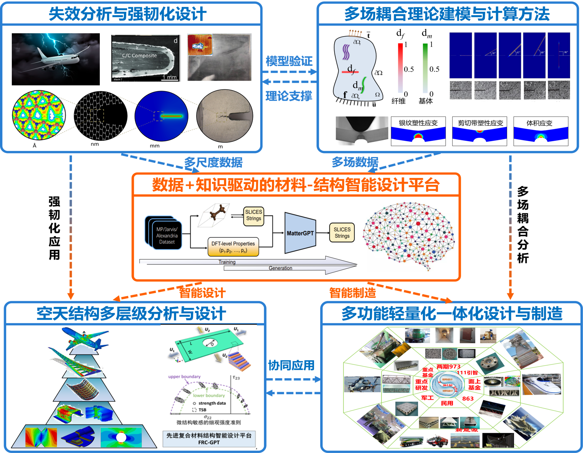随着第四次科技/工业革命大爆发,人类开始进入数智时代,数字化和智能化融入人类生产、生活方方面面。空天装备换代升级,性能极限化、环境极端化、决策智能化,对空天装备设计、分析、制造提出了前所未有的挑战。结构是实现空天装备性能的基础,设计是手段、制造是途径,数智力学涉及数和智的融合,探索物理空间、信息空间、认知空间相互作用规律,将为空天装备智能设计、智能分析与智能制造一体化提供创新解决方案。我们研究团队围绕空天装备智能设计、分析、制造开展五方面研究:(1)先进材料和结构失效分析与强韧化:建立了多时空尺度耦合的材料、结构失效分析方法,实现了对极端环境下材料失效行为的精准预测与控制。(2)材料到结构智能设计:融合机器学习与多尺度分析方法,构建了从材料到结构一体化智能化设计平台,实现了从材料组分、微观结构到宏观性能的跨尺度智能优化,为空天装备轻量化设计提供了有力工具。(3)航天航空结构多层级分析与设计:揭示了空天结构多层级失效机理及多层级结构-性能传递关系,发展AI辅助结构强度智能设计方法,显著提升了航空航天结构设计和分析效率。(4)AI驱动的多尺度多场耦合理论建模与计算:针对空天装备服役中的结构-热-电-磁多物理场耦合问题,建立了高精度计算模型和智能分析方法,实现了复杂环境下材料性能的准确预测和优化。(5)多功能轻量化结构功能一体化设计与制造:开发了面向空天极端环境的高性能结构智能优化算法与增材制造集成技术,实现了结构-功能一体化设计与制造过程的数字孪生与智能控制。