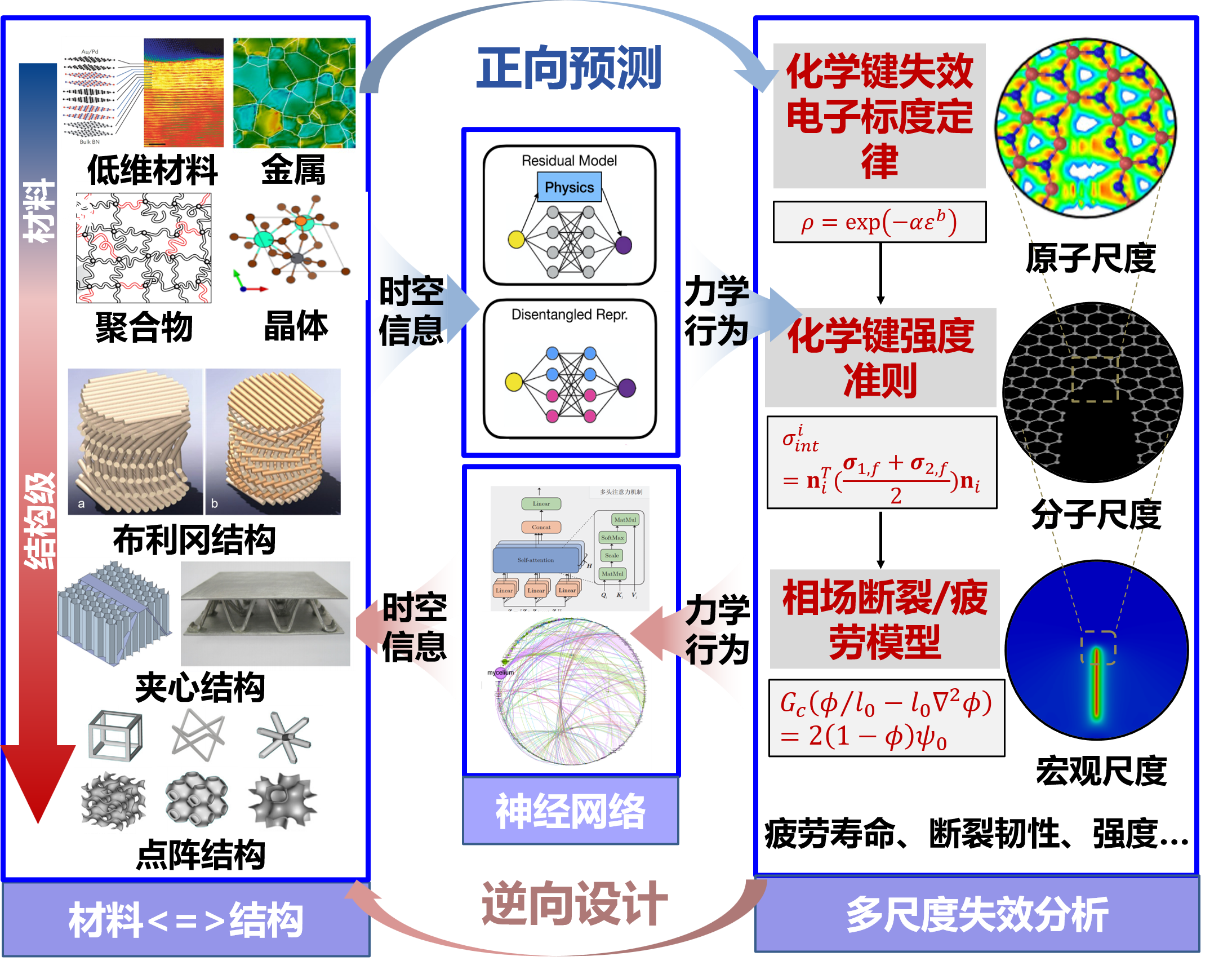 提出了基于多尺度计算与人工智能的材料智能设计新范式。通过构建从原子到结构的层次化表征体系,解析材料与结构的时空演化特征,揭示多尺度结构-性能的关联机制;构建物理信息嵌入的数据驱动模型,实现材料组分到宏观性能的高精度跨尺度映射;发现多尺度分析方法,系统研究材料从原子、分子到宏观尺度的疲劳寿命、断裂韧性和强度等性能指标;开发逆向设计算法与平台,通过多尺度性能约束优化实现材料组分和结构协同调控,为先进材料在极端服役环境下的创新应用提供理论指导和方法支撑。