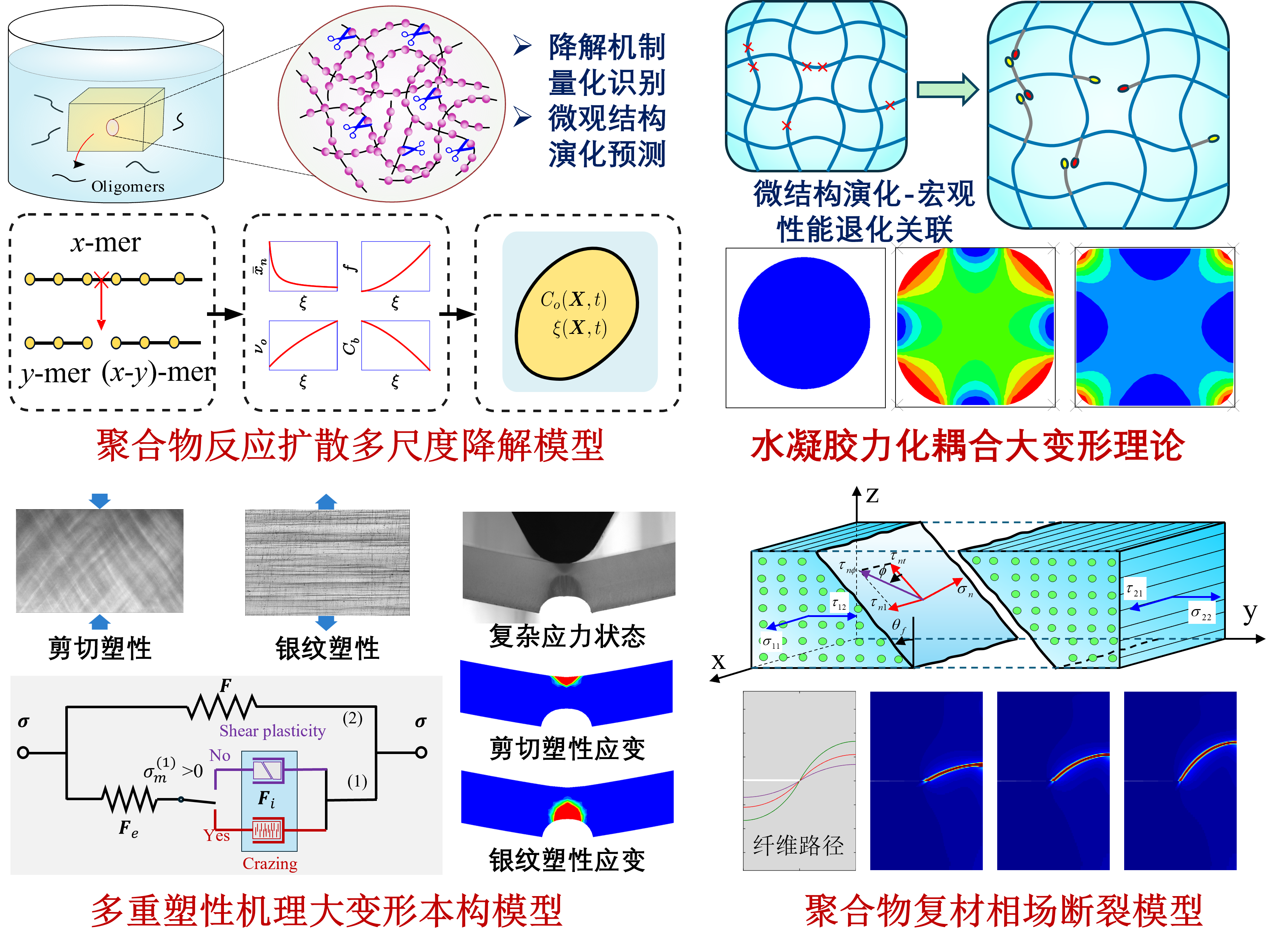 聚焦于先进聚合物基材料在多场耦合作用下的多尺度失效问题,致力于发展新理论和计算模型,并揭示材料微观结构对宏观失效行为的影响,为聚合物基材料的失效预测以及性能优化提供理论支撑。1)提出了可降解聚合物反应-扩散多尺度降解模型,揭示了链切割微观机制,实现微结构演化精确预测,为可降解聚合物应用提供理论基础;2)提出了聚合物凝胶力化耦合大变形本构理论,建立了分子拓扑结构演化与力学性能退化的构效关系,实现了水凝胶全降解周期性能演化和力化耦合行为的精确预测,为发展可调控性能聚合物提供定量依据;3)建立了能同时描述剪切与银纹塑性微观失效机理的聚合物大变形本构模型,实现了复杂应力状态下变形失效响应精准预测,为聚合物塑性变形失效行为研究提供理论基础;4)发展了聚合物基复材多相场断裂模型,该模型在聚合物复材断裂预测精度上优于现有主流断裂模型;研究阐明了微观纤维铺设对宏观裂纹扩展路径和断裂韧性的调控机理,为断裂增韧设计提供新思路。